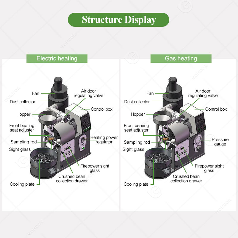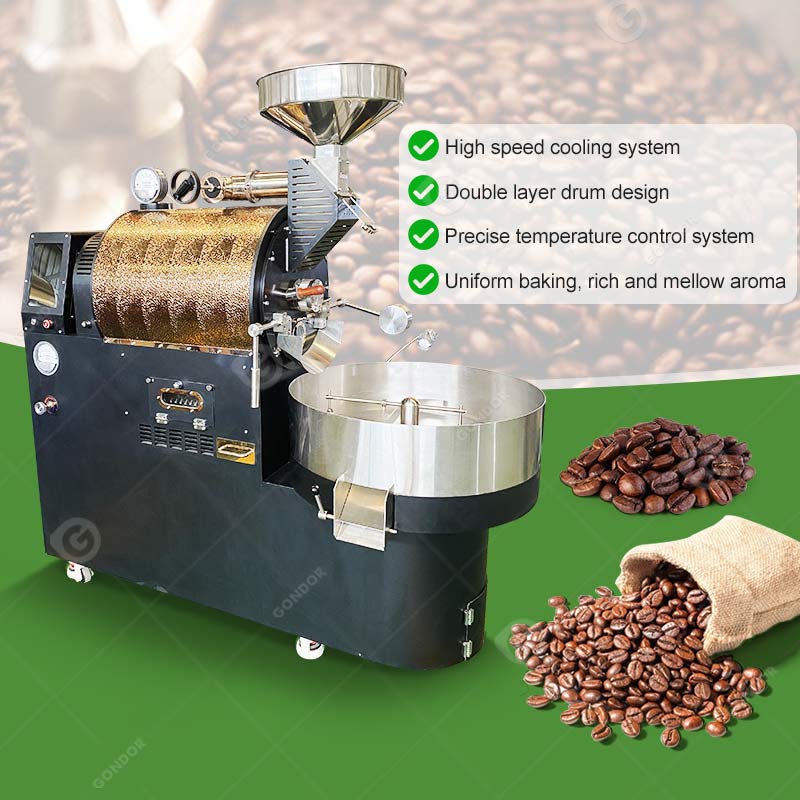 The Gondor coffee bean roaster is a specialized device used to heat green coffee beans and transform them into drinkable coffee beans. It typically heats green coffee beans to 180-230°C, controlling parameters such as temperature, Zeit, and airflow to trigger the Maillard reaction and caramelization, causing the green beans to undergo physical expansion, chemical transformation, and the development of specific flavor characteristics. This achieves roasting effects to meet different flavor requirements.