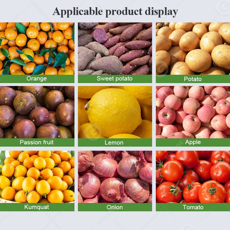 This equipment is specifically designed for various round and near-round fruits, including but not limited to: oranges, apples, lemons, passion fruit, longan, cherry tomatoes, pommes de terre, walnuts, etc..