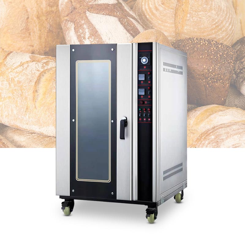 Itu electric commercial convection oven is a key piece of equipment in modern industrial and food processing. Its design integrates several advanced features: an efficient hot air circulation system, safe explosion-proof lighting, easy-view double-layer heat-resistant glass, and a precise hidden spray humidification system. Lebih penting lagi, it operates by using heating elements to rapidly warm the air. A high-performance circulating fan then drives this hot air evenly throughout the oven, ensuring highly consistent temperature distribution across all areas inside.
