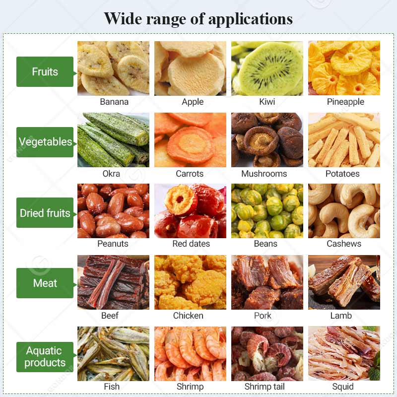 Vacuum frying machine can process various products including fruits (apple chips, banana chips, mango chips), sayuran (carrot chips, pumpkin chips, potato chips), meats (chicken chips, fish skins), gila (peanuts, almonds), and specialty snacks (crispy rice cakes, banana spring rolls). It supports both sweet and savory flavor profiles with oil content reduced by 30-50% compared to traditional frying.