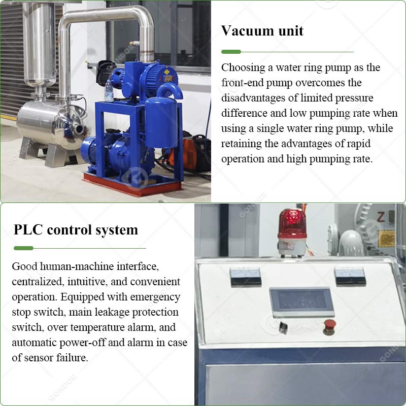 The vacuum system uses a water ring pump as the forestage pump, balancing high pumping speed with stable performance. The PLC control system not only boasts a user-friendly and intuitive interface but also features multiple safety devices such as emergency stop and leakage protection. Over-temperature alarms and automatic power-off in case of sensor malfunctions ensure safe operation.