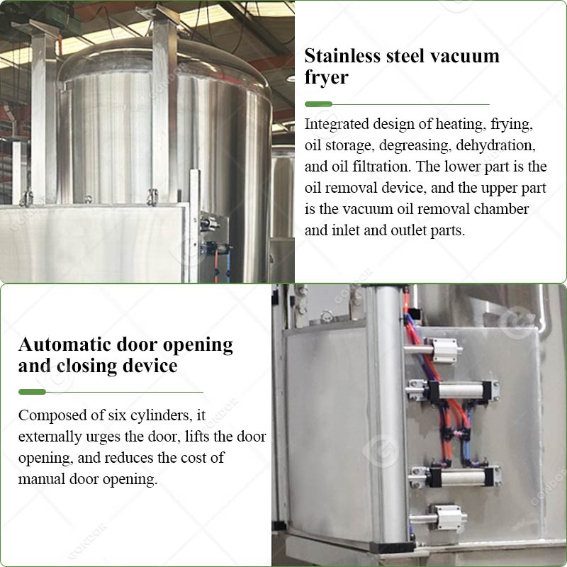 This stainless steel vacuum frying machine features an integrated design encompassing heating and frying processes. It includes an oil removal device at the bottom and a vacuum degreasing chamber and feeding/discharging components at the top. Its six-cylinder automatic door opening and closing device reduces labor costs.