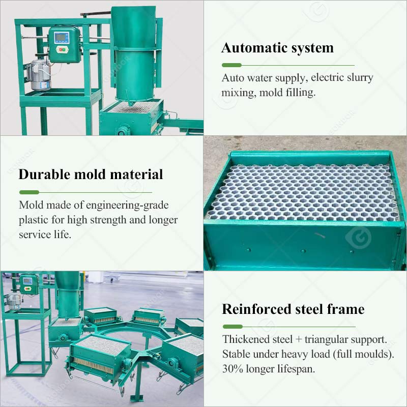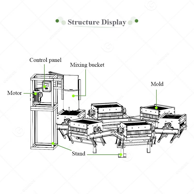 This machine has the functions of automatic water supply, electric stirring, automatic mold filling and rapid demoulding, etc. The structure adopts thickened steel frame and reinforced frame, which runs smoothly and can meet the needs of long-term and high-load production.