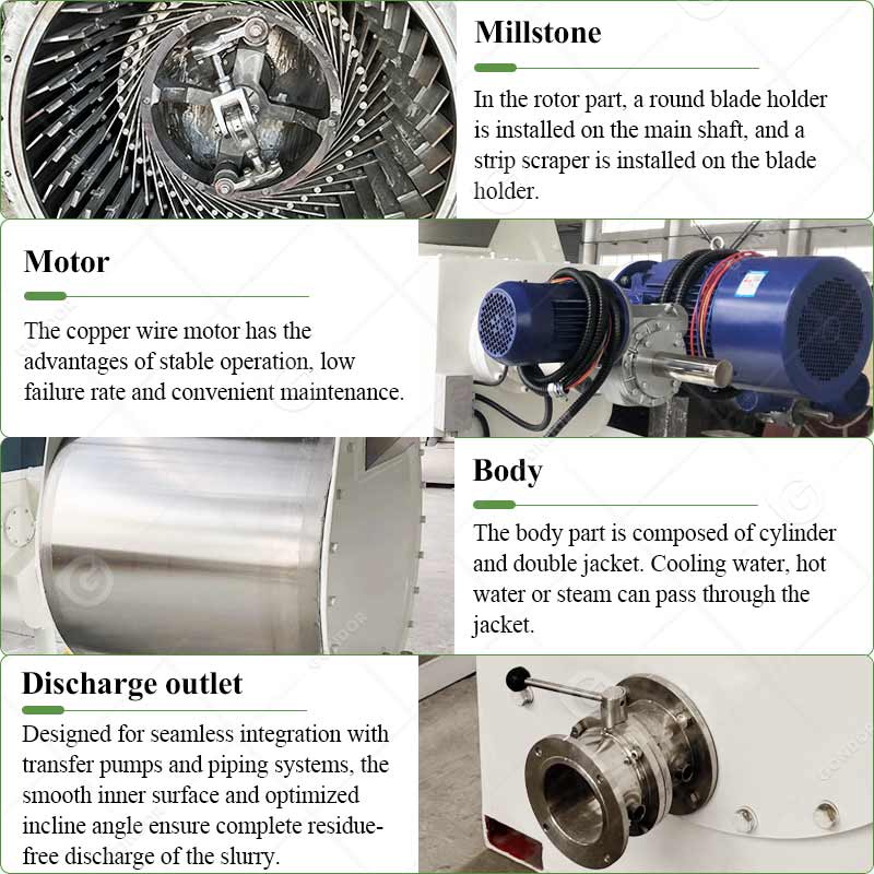 - Grinding System (Rotor Assembly): The main shaft features a circular blade holder equipped with precision scrapers to ensure continuous and uniform material processing.