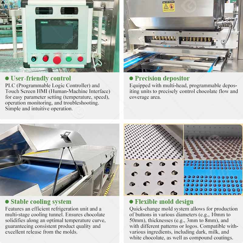 Features a rapid mold change mechanism, supporting the production of chocolate buttons with diverse specifications. Accommodates a wide range of raw materials, including dark chocolate, milk chocolate, white chocolate, and compound chocolate coatings.