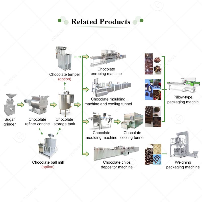 Gondor chocolate depositing production line is engineered to process tempered chocolate liquor. In addition to accommodating dark, milk, and white chocolate, it further handles chocolate blended with ingredients such as nut pieces or cookie crumbs.Here are some key applicable products for this chocolate depositing equipment.