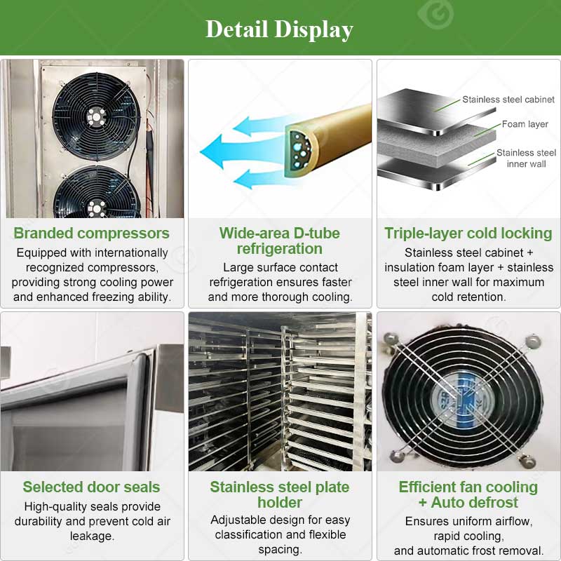The blast freezer is equipped with internationally renowned brand compressors, with strong refrigeration capacity and stable operation. Its unique wide-range D-type controlled cooling structure further expands the contact cooling area, makes the cooling process faster and more thorough, and can retain the nutrition, texture and taste of food to the greatest extent, which is especially suitable for large-scale food processing needs.