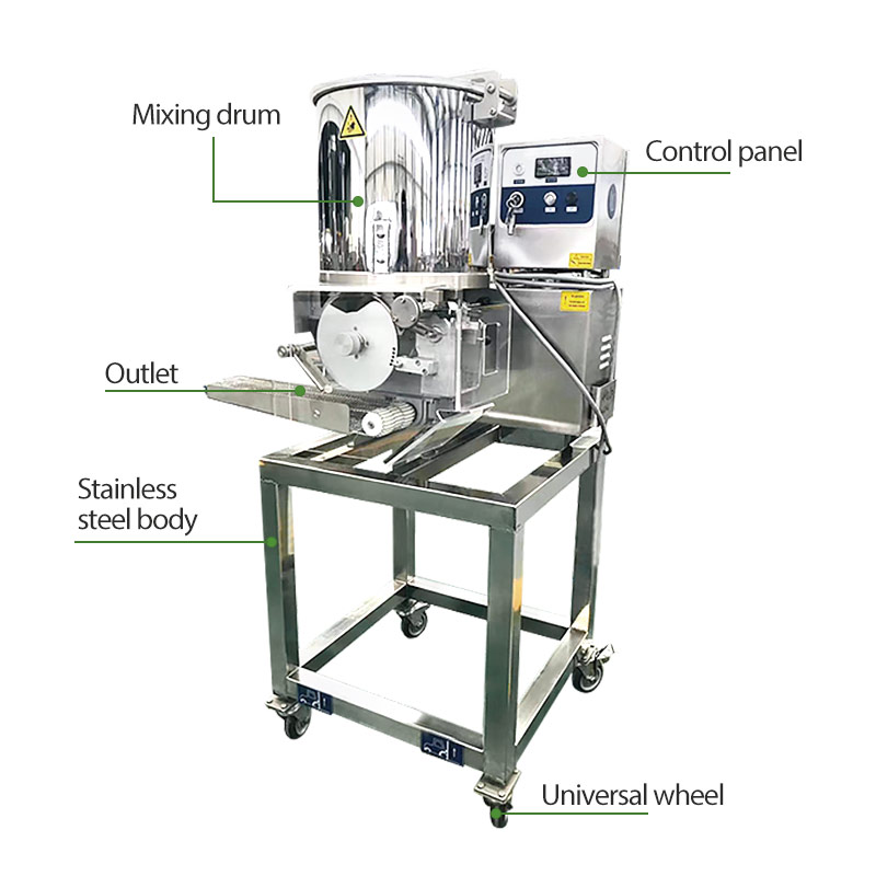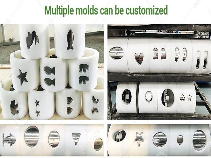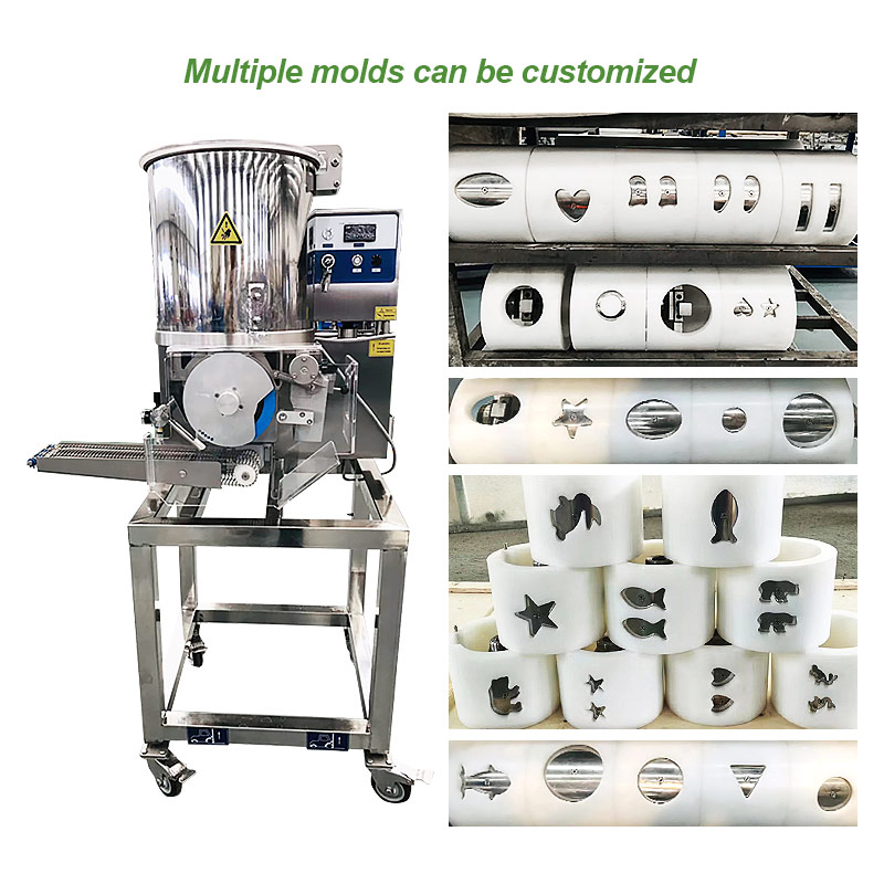 The SS304 material outlet provides a hygienic food contact surface meeting international safety standards, making it suitable for fast food central kitchens, frozen food plants, and institutional catering. The automatic paper feeder enables precise weight and thickness control—essential for airline catering, school meals, and export-oriented factories. Easy-to-replace molds allow rapid changeover between round patties, four-lobed nuggets, square vegetable cakes, or heart-shaped products, giving manufacturers the flexibility to adapt to market demands.